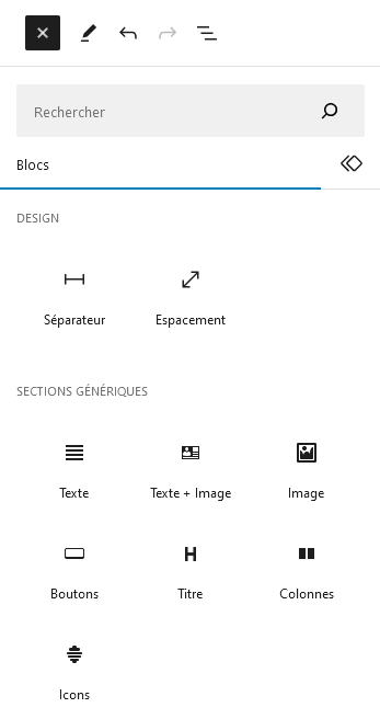 Tout contenu est obligatoirement compris dans un bloc. Pour ajouter un bloc, rendez-vous dans la section « blocs » accessible via le bouton « + » en haut à gauche de la page.