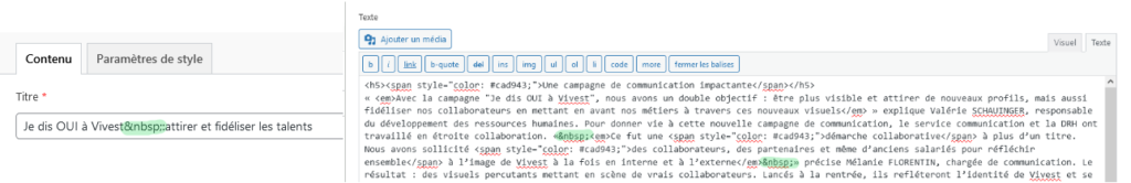 Pour ce faire, dans chaque champ de contenu qui contient du texte, il est possible de remplacer tout espace par « » pour créer un espace insécable. Dans l’éditeur de texte de WordPress, attention à bien-être en mode « Texte« .